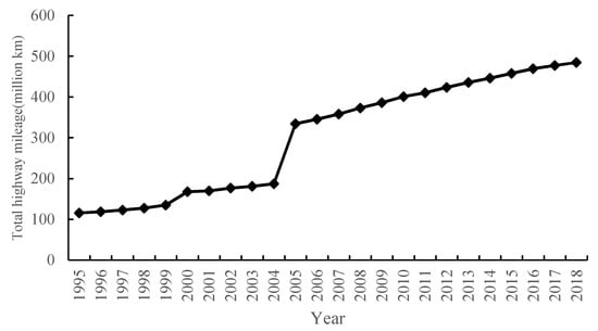 The research time of this paper is from 2004 to 2017, and the following factors are mainly considered: (1) from 1995 to 2004 (Figure 2), the total mileage of China’s highways was basically maintained within 1 to 2 million kilometers, and the total mileage of highways increased by 6.16% annually. However, as the “Tenth Five-Year Plan” (2001–2005) proposed to improve a smooth, safe, and convenient modern comprehensive highway system, China’s highway infrastructure construction has entered into a period of rapid development since 2004. By the end of the Tenth Five-Year Plan (2005), China’s total highway mileage increased from 1.698 million kilometers in 2001 to 3.3452 million kilometers. Therefore, this paper chooses 2004 as the starting year of the study. (2) Cultivated land area is one of the main evaluation indicators of cultivated land use efficiency. The current China Rural Statistical Yearbook has been updated to 2019, but even in the 2019 China Rural Statistical Yearbook, only the area of cultivated land in 2017 can be obtained. Therefore, the end year of this study is 2017.