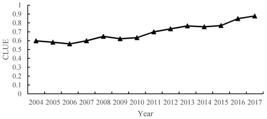 With the help of the SBM-oriented module in the DEA solver Pro 5 software, the value of CLUE was obtained for each province of China (Figure 3). With regard to time, the CLUE shows an overall rising trend, but with some fluctuation (there was a slight downward trend in 2006, 2009 and 2014). Above all, with the development of social economy and the improvement of farmland use technology, the average index of CLUE increased from 0.59 in 2004 to 0.88 in 2017, with an average annual growth rate of 3.34%.