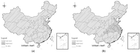 Meanwhile, it can be seen from Table 7 that the sum of highway density and the spatial lag of highway density in other provinces has a significant impact on CLUE in the single threshold regression model, reaching a significance value of 1%. The value of the single threshold is 2.4152. When the sum of highway density and the spatial lag of highway density in other provinces is lower than the threshold value of 2.4152, the acceleration of highway infrastructure construction can lead to an improvement in CLUE, whereas if the sum is higher than the threshold value of 2.4152, this effect is significantly reduced. On this basis, the study samples were divided into two sections: low level (sum of highway density and the spatial lag of highway density in other provinces < 2.4152) and high level (sum of highway density and the spatial lag of highway density in other provinces ≥ 2.4152). In order to reflect the interval change and to take into account the current highway situation, this study divides the intervals according to the average highway density of each province over time and the highway density in 2017 (Shown in Figure 6).