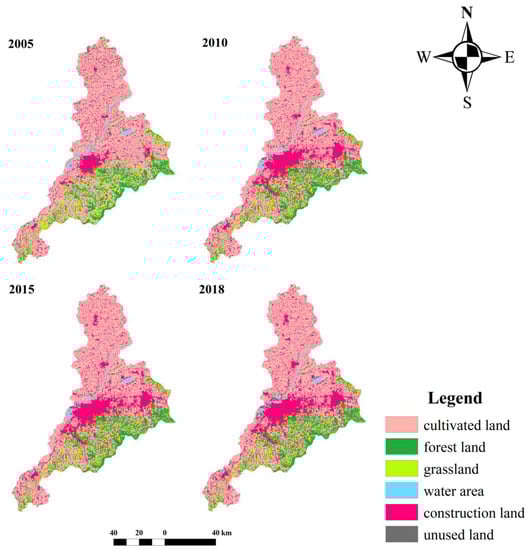 The land use change data of China’s Shandong Province in 2005, 2010, 2015, and 2018 on a scale of 1:100,000 provided by the China scientific resources and environmental science data center were used, and the primary classification system was adopted, including cultivated land, forest land, grassland, water area, construction land, and unused land. Through the leading technologies such as remote sensing monitoring (ENVI5.3, California, United States) and geographic information system (ArcMap10.6, California, United States), the four phases of land use remote sensing data of Shandong Province in 2005, 2010, 2015, and 2018 and the boundary vector file of Jinan City were used to merge and crop the land categories to obtain the four phases of land use data of Jinan City (Figure 2).