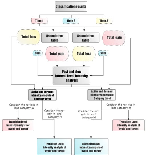 Figure 3 is the technical flow chart of intensity analysis, and Table 1 gives the mathematical notes and their meanings used in intensity analysis. The intensity analysis is conducted by making a correlation table for each consecutive time interval from the results of remote sensing image interpretation for each time interval, calculating the total gain area of each land class and the total loss area of each land category, and calculating the total change area of each time interval. The intensity analysis of the interval levels was established by comparing the area change and intensity change of each time interval. The average change intensity ratio of multiple levels, called average change intensity, was also calculated.