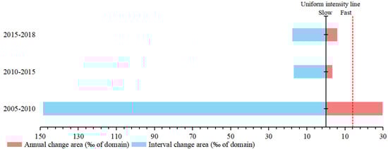 At the interval Level (Figure 4), the change intensity from 2005 to 2010 was greater than the average change intensity on the right side of the figure, indicating a rapid pattern of land use change at this interval level from 2005 to 2010. The change intensity from 2010 to 2015 and from 2015 to 2018 were less than the average intensity of change, indicating a slow change pattern at this interval level. As can be seen from the area change on the left side of Figure 4, the area change and intensity change were essentially proportional, with the smallest area change from 2010 to 2015, accounting for only about 3.36‰ of the study area; the largest area change was from 2005 to 2010, accounting for about 29.68‰ of the study area.