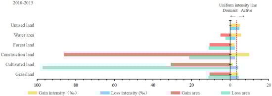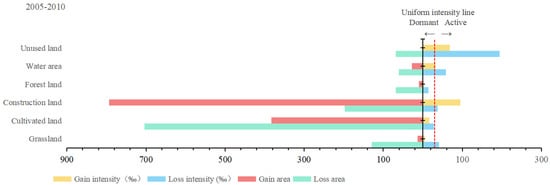 At the land category level, the relationship between the gain and decrease in the change intensity of the land category and the average intensity of change is used to reflect whether the land category exhibits systematic stability throughout the interval. Taking Zhangqiu District of Jinan, where the calculation results were representative, as an example, the increase and decrease in the change intensity of cultivated land, forest land, and grassland were smaller than the annual gain in the change intensity and the average decrease in the change intensity. Thus, the three land categories showed systematic stability throughout the time interval. In contrast, from 2005 to 2010, the intensity of the decrease in construction land was less than the average change intensity. Its increase was greater than the average change intensity; therefore, the construction land showed an active change pattern at the land category change level during this time interval.