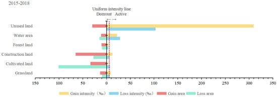 From the change area on the left side of Figure 5, Figure 6 and Figure 7, the gain and loss of construction land and cultivated land were larger in each time interval, and the gain area of construction land was larger than the decrease area as a whole three time intervals. In contrast, the loss area of cultivated land was larger than the gain area in all three time intervals, resulting in a spatial transformation phenomenon. Grassland losses from 2005 to 2010 were second to construction land and cultivated land, and water area losses from 2015 to 2018 were greater than those of grassland. A comparison of the six land categories showed that the gain in the area of construction land was much greater than the loss, and its intensity showed very high activity.