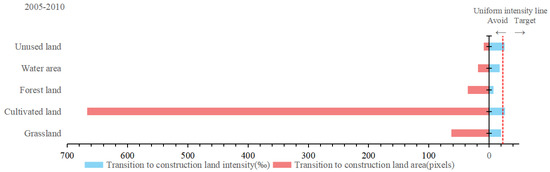 Intensity analysis for transition to construction land based on the observed gains, 2005–2010.