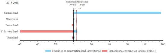 Intensity analysis for transition to construction land based on the observed gains, 2015–2018.