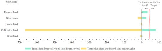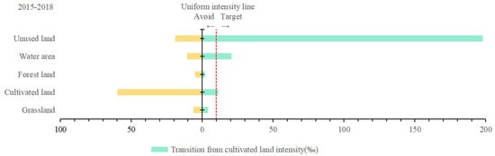 Let us consider at the pattern of increasing transition levels, taking construction land as an example. As shown on the right side of Figure 8 and Figure 9, the change intensity in the increasing transition of cultivated land is was greater than the change intensity in the average transition from 2005 to 2010 and 2010 to 2015, indicating that the increase in construction land mainly originated from cultivated land rather than another land category. As shown on the right side of Figure 10, the change intensity in the increased transition of unused land was greater than the change intensity in the average transition from 2015 to 2018, indicating that the increase in construction land mainly originated from unused land. In contrast, the change intensity in forest land was smaller than the average intensity of change in all three-time intervals, indicating that the increase in construction land avoided the occupation of forest land.