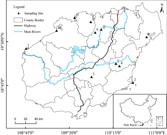 The distribution of sample plots. Note: The distribution of 13 sample plots in Wanning, Qiongzhong, Qionghai, Changjiang, Wenchang, Chengmai, Danzhou, and Lingao, Hainan, China. The specific information of the sample is listed in Table 1.