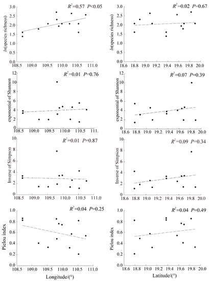 The Hill numbers and Pielou index are all based on individual abundance [47,63]. The exponential of Shannon diversity (Hill number N1), for instance, is a comprehensive indicator reflecting diversity, representing both the number of plant species and the uniformity of spatial distribution of different species [52,64]. The inverse of Simpson diversity (Hill number N2), on the other hand, can better reflect community dominance [65,66], and the Pielou index mainly represents species density and evenness in a community. The exponential of Shannon diversity showed no regularity in the east–west direction, while the Pielou index was opposite to the trend of species richness, indicating that precipitation was no longer the main controlling factor of species evenness. The specific reasons for our observations need further study. The exponential of Shannon diversity, the inverse of Simpson diversity and Pielou index all show an increasing trend from south to north, which is consistent with the research on the shrub of Rosa chinensis in north China [67] and contrary to the large-scale spatial pattern across the world [68,69]. This may be due to the low latitude of Hainan, so there is little difference in the annual average temperature in all regions. As a result, negative correlation between species diversity and latitude mainly caused by light and temperature could not be reflected.
