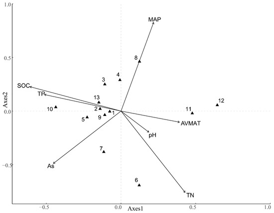 The Redundancy Analysis ordination diagram of species diversity indices and environmental factors. Note: AVMAT: annual variation of mean annual temperature; MAP: annual mean precipitation; As: aspect; SOC: soil organic carbon; TN: soil total nitrogen; TP: soil total phosphorus. Numbers 1–13 represent the 13 samples listed in Table 1.