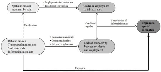 Many urban spaces in the developing world, represented by China, are currently in a period of rapid sprawl. The resulting urban spatial alienation and separation of residence and employment is a phenomenon that has become obvious. The disadvantaged groups who cannot afford the high housing prices in the city center and are gradually moving to the urban periphery are facing similar spatial barriers to employment and welfare deprivation as the Blacks in the inner cities of the United States, and failure to address these problems in time will likely lead to spatial injustice and social imbalance [1,25]. In the face of this emerging reality, it is necessary to clarify a series of questions such as “which groups are affected by spatial mismatch, what are the manifestations of spatial separation, to what extent does the separation lead to welfare loss for the groups concerned, and what are the real causes of spatial mismatch” in order to find answers to these issues. This requires a return to the theory of spatial mismatch itself and a reconsideration of the practical and theoretical propositions that it implies. In fact, since its first formulation by Kain, the spatial mismatch hypothesis has illustrated the theory elements, including the group concerned, influencing factors, spatial relationship manifestation, and consequential effects hierarchically. Therefore, this study aims to analyze the hierarchical elements of the spatial mismatch theory, and to sort out the whole process from the debate to the continuous expansion of its theoretical elements, as well as to reaffirm its theoretical value in solving the increasingly prominent spatial and social injustice of many cities.