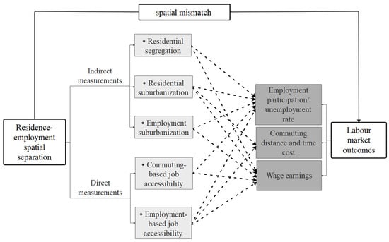 It is always emphasized that spatial mismatch is formed when spatial separation of employment from residence and the resulting adverse labor market outcomes occurs in both stages. Spatial mismatch was first proposed through research which found that inner-city Blacks had higher unemployment rates due to geospatial mismatch from employment resources. As the research progressed, indicators of labor market outcome status such as employment participation, commuting, and income, as the main manifestations of the consequences of spatial separation, gradually became important indicators of the consequences of spatial separation in the test of spatial mismatch. Employment participation is the most commonly used indicator to characterize labor market outcomes, and where job accessibility is high, employment rates are relatively high [77,78]. Commuting distance, time, and cost were also another indicator of early empirical evidence of spatial mismatch. It was later suggested that distance, time, and cost alone do not fully represent the burden imposed on commuting, and that a combination of commuting costs may be a better option, taking into account the degree of inaccessibility and other unforeseen problems in commuting [79]. The wage income indicator was developed as a result of research that found that Black Americans in inner cities may shift from higher-wage jobs to lower-wage jobs in response to the spatial mismatch caused by suburbanization of employment, and that these Blacks may have no change in employment participation and a shorter commute, but significantly lower wages and earnings [80]. When conducting spatial mismatch tests, there are multiple combinations of how indicators are selected to reflect spatial separation as well as reflect labor market outcomes (Figure 2). This combination of different indicators, combined with the methodological challenges faced in the use of the indicators, has led to differences in the empirical results and the debate on the objective existence of spatial mismatch [81]. However, integration with labor market outcomes has been emphasized by spatial mismatch since its inception, and this is exactly where it distinguishes from macro-spatial pattern studies.
