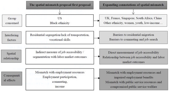 Soon after the spatial mismatch hypothesis was put forward, empirical studies using different indicators, methods, and studies on different groups have intensively debated the objective existence of spatial mismatch [5,6,7,8]. With the continuous expansion of spatial mismatch research in terms of groups concerned, influencing factors, and spatial relationship metrics, more and more scholars have moved from objective existence examination to asking about the mechanisms of spatial mismatch [9,10,11,12], and have devoted themselves to extracting and summarizing from empirical studies and constructing theoretical models to upgrade spatial mismatch hypotheses into theories [13,14,15,16,17,18]. Meanwhile, scholars in various countries have combined spatial mismatch research with country-specific scenarios such as public housing allocation, public transport development, urban spatial planning, and slum upgrading, making spatial mismatch theory widely used [19,20,21,22,23,24]. In a word, spatial mismatch has been studied for more than half a century, and has gone through different stages of theoretical hypothesis, objective existence debate, and hypothesis rising into theory; its connotation has been enriched and its application has been expanded. However, there are few studies to sort out the whole process of the development of spatial mismatch theory and to refine its theoretical essence, making the current research on spatial mismatch biased in the following two aspects: one is to confuse spatial mismatch with housing segregation, job accessibility, and job-housing separation, and the other is to focus on the analysis of the spatial structural relationship between housing and employment at the macro level of aggregation, ignoring the impact on the relevant groups in terms of employment participation, wage income, and other labor market dilemmas. As a result, most of the current studies point to macro spatial distribution issues such as the balance of employment and residence, as well as urban planning, and lack sociological perspectives on issues such as social justice and spatial equity, which deviates from the original purpose and essence of spatial mismatch theory.
