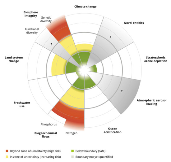 Figure 1). The associated diagram divides the natural resources into nine elements. From the assessment of the EEA (2019) of the status of the planetary boundaries, it is clear that some planetary boundaries are under severe threat or are already far beyond their carrying capacity. The most urgent elements are: (1) biosphere integrity, which can be roughly seen as the decline in biodiversity; (2) biogeochemical flows—specifically, nitrogen and phosphorus cycles are over-exploited and not sustainably managed; and (3) climate change.