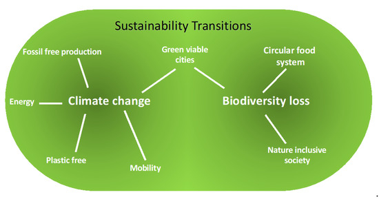 32]. These transitions can be organized roughly into two branches: the first relates to climate change and the elimination of the use of fossil fuels for electricity generation, production (of furniture, clothes, household devices, and plastics for packaging and other uses), and mobility; the second relates to reconnecting to nature, a nature-inclusive biodiverse society in cities and rural areas, and the production of food in a nature-inclusive and circular manner. The identified transitions are: (1) energy, (2) mobility, (3) fossil fuel-free production, (4) viable cities, (5) a nature-inclusive society, and (6) a circular food system (