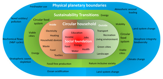 Figure 4 presents a graphical summary of the concepts we use and their relationships. The planetary boundaries are shown in the outer ring as a safe living environment from a biophysical point of view, and the inner red box represents the social foundation as the minimum socially just level. The two inner rings show the elements of the circular household (inside and outside of the house), and the ambitions of the sustainability transitions and the “safe operating space” of the households.