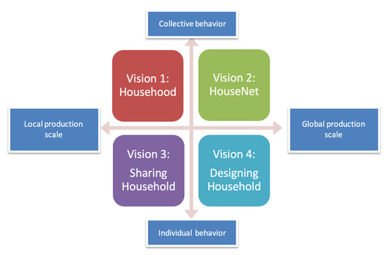 Figure 5). The first quadrant is the Househood, which is a neighborhood seen as a circular household; in this quadrant, a local scale of production and consumption is combined with a future in which our behavior is more collective. Consequently, a whole neighborhood starts living together as a household, shares many communal places and activities, and, for example, jointly grows food and recycles products within the neighborhood.