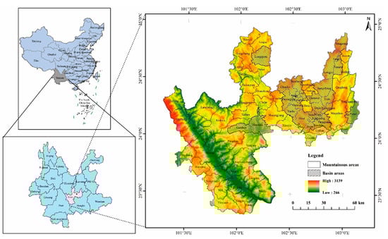 Yuxi City is located in the central part of Yunnan Province, on the Yunnan Plateau at low latitudes. It belongs to the subtropical plateau monsoon climate, ranging from 23°19’ to 24°53’ north latitude and 101°16’ to 103°09’ east longitude (Figure 1). Yuxi is located in the core position of Yunnan Province, connecting the east to the west and connecting the north to the south. It is adjacent to the provincial capital, Kunming, which is to the northeast; Chuxiong Autonomous Prefecture in the north; Pu’er city in the southwest and Honghe Autonomous Prefecture in the southeast. The city covers an area of 15,285 km2 and has jurisdiction over 75 townships (towns and streets) in 7 counties and 2 districts []. The terrain of Yuxi City is high in the northwest and low in the southeast. The western part is mainly deep-cut alpine and valley landforms, the central and eastern parts belong to the mountainous areas of central Yunnan and are dominated by mid-mountain landforms, and the eastern part is mainly plateau lake basin landforms. The Chengjiang, Jiangchuan and Tonghai lacustrine basins are formed around three plateau rifted lakes, the Fuxian Lake, Xingyun Lake and Qilu Lake, with flat and open terrain []. According to its special topography, combined with administrative regions, it can be divided into two types of geographical spaces: mountainous areas and basin areas []. Due to the complex terrain and large height difference, the mountainous area generally has more rainfall than the basin area. The cultivated land in the mountainous area is shallow and the soil fertility is low, but the basin area has fertile soil and more farmland with high and stable yields. From 1995 to 2018, the urban population growth and economic development in the basin area were significantly higher than those in the mountainous area, and the land-use change and social and economic development status differed significantly between the mountainous area and the basin area [].