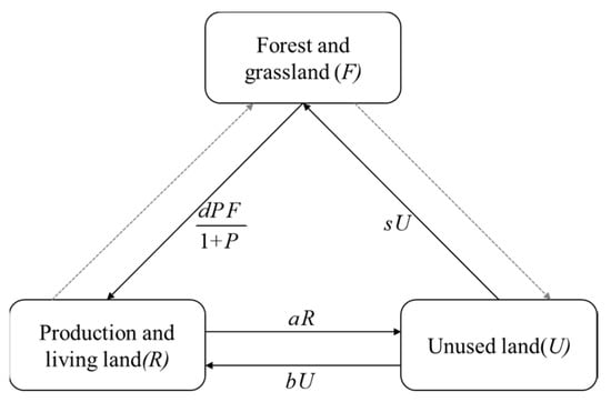 - Since there will be a time delay in the evolution of land use, the transfer mechanism of three land types is shown in Figure 2. The area of production and living land at time t is R(t). Due to the abandoned farmland or construction land, it can be converted into unused land U(t) within a period of 1/a, and become forest and grass land through natural succession or ecological restoration after a period of 1/s. The unused land can also be converted into production and living land after a time interval of 1/b.