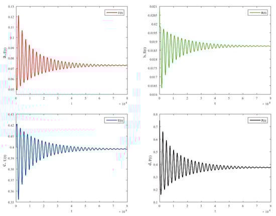In order to make the application of the human–land coupling dynamics model meaningful in Yuxi City, it is necessary to find the sufficient conditions for the model’s stability and discuss the stability of the model’s equilibrium point and the sustainability of the model. Therefore, the model’s equilibrium point is solved first, and the model’s stability is further analyzed through the model’s equilibrium point. When solving the fractional model, the Adama–Bashforth–Moulton predictive correction algorithm is applied []. To facilitate calculation, let the step size ∆t = 0.01, ϕ = 0.9, substitute r = 0.0048 into the model, and then through data analysis and simulation, parameters a = 0.034, b = 0.012, s = 0.004, h = 0.05, d = 0.08 can be obtained. After a normalized processing of the data for various types of areas and the population of Yuxi City in 1995, the initial values are F(0), R(0), U(0), P(0) = (0.07, 0.02, 0.4, 0.75); substitute them into Equation (3). Then, the equation