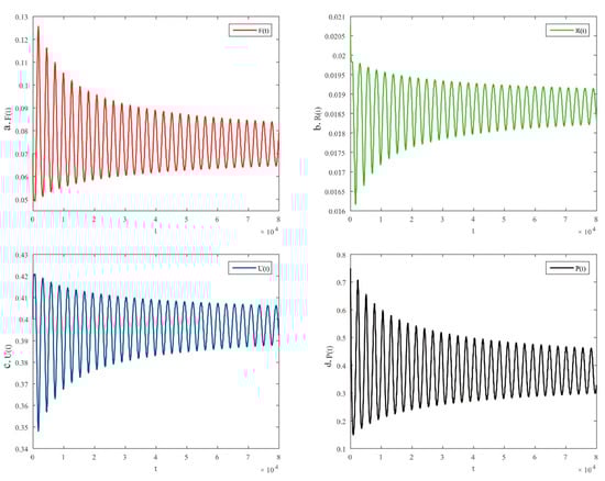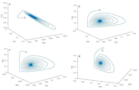 The basic reproduction number R0 of the human–land coupling dynamics model is a very important parameter; it is said that in the state of balance, the amount of the increase in population brought by land-use changes is a sign that decides whether the land-use type changes or not, namely, only when R0 > 1 does land-use-type transformation occur. If R0 < 1, the transformation will tend to zero. Therefore, according to the calculation method of the basic regeneration number [], the basic regeneration number of the model can be obtained after solving for the equilibrium point, , indicating that the land-use types’ transformation is significant in the model. Through calculation, ω0 = 0.002358, τ0 = 728.403 []. An arbitrary τ value which is less than τ0 was chosen arbitrarily, and MATLAB software was used for numerical simulation. Let τ = 700, and it can be seen through numerical simulation that the human–land change trend over time and the three-dimensional evolution of the human–land relationship can be obtained after a period of damped oscillation (Figure 3 and Figure 4). As τ = 700 < τ0, both the theoretical and numerical simulation show that the equilibrium point (0.075617, 0.021169, 0.44984, 0.423379) is locally asymptotically stable, that is, under the influence of the population, the development and change value of all kinds of land use fluctuates, but eventually tends to be stable around the equilibrium point of the model.