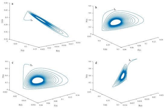 When the time delay τ exceeds τ0 = 728.403, after the simulation running time of t = 8 × 104, the population and land types change from the initial large fluctuations to periodic changes around the equilibrium points (0.075617, 0.021169, 0.44984, 0.423379) (Figure 5); that is, in an unstable state, it is significantly different from the situation when the time delay τ is less than τ0 (Figure 3). When the time delay becomes larger, the area of forest and grass land F(t), the area of production and living land R(t) and the area of unused land U(t) will change periodically. The forest and grass land change periodically around 0.075617 (Figure 5a), the production and living land change periodically around 0.021169 (Figure 5b), and the unused land changes periodically around 0.44984 (Figure 5c), and will not tend to a stable value. Figure 6 shows the three-dimensional evolution of the human–land relationship when τ = 740, which explains the dynamic characteristics of the human–land coupled system in the unstable state. It can be seen that when the time delay is greater than τ0, the system exhibits an unstable periodic oscillation phenomenon.