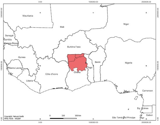 We considered Ghana’s Upper West, Northern, and Upper East provinces as the study area for this Intensity Analysis (Figure 1). These regions of Ghana represent the West Sudanian Savanna ecoregion, an ecologically important, yet highly threatened, ecoregion of West Africa. In the West Sudanian ecoregion, the climate is hot and semi-arid. Annual rainfall ranges from 1000 mm in the south to 600 mm in the north at the edge of the Sahel. The study area is characterised by a relatively dry and hot climate and mainly comprises scattered, rainfed crop fields and open tree savanna. Further south, the Guinea Savanna ecoregion is characterised by the extensive, wooded savanna characteristic of the Guinean Region. The predominantly sandy soils of the region have low nutrient-holding capacity, which must support an expanding population of more than 2.5 million people. Agriculture is the main source of livelihood, with the bush–fallow system and the large-scale browsing and grazing of goats, sheep, and cattle being the typical practices.