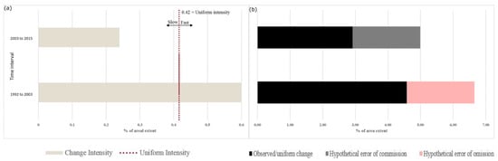 Intensity Analysis for interval-level changes of land category during the 1992–2003 and 2003–2015 time intervals for the study area showing (a) the observed change intensity (annual change averaged over the interval), and (b) the percentage of area that changed category over the interval.