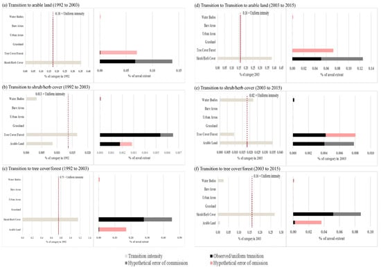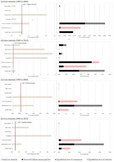 We interpreted the results of the Intensity Analysis, assuming that the land transitions observed in the study are actual changes. However, map classification errors may lead to false change-detection. The Intensity Analysis computes hypothetical map classification errors to account for the deviations from the uniform intensities of change. According to this framework, if the hypothetical error is greater than the suspected errors, then the actual land transitions deviate from the uniform change intensity [29]. For this study, the suspected rate of classification error in the 1992, 2003, and 2015 land-cover maps is 25% for each period. Furthermore, the hypothetical errors of commission sum up to the total hypothetical errors of omission (Figure 2, Figure 3 and Figure 4). The results suggest that the errors on 2.07% of the areal extent could potentially explain the deviation from the uniform change (Figure 3). Errors on 0.20% of the 2003 map (Figure 3a) and errors on 0.1% of the 2015 map (Figure 3b) could potentially explain all deviations from uniform gains. Similarly, errors on 0.38% of the 1992 map (Figure 3c) and errors on 0.14% of the 2003 map (Figure 3d) could potentially explain all deviations from uniform losses. Errors of less than 0.20% of the 2003 map could potentially explain all deviations from uniform transitions to each gaining category (Figure 4a–c). Errors amounting to less than 0.10% of the 2015 map could potentially explain all deviations from uniform transitions to each gaining category (Figure 4d–f).