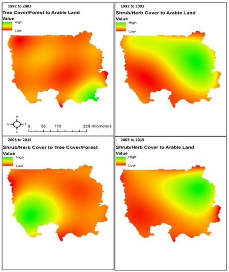 As shown in Figure 5, some of the tree/forest-cover land was converted to arable land in the south-eastern part of the study area during 1992–2003, while a sizeable area under shrub/herb-cover in the eastern and northern regions also changed to arable land. Similarly, more shrub/herb-cover transformed into arable land in the eastern belt in the second time interval, while some new tree/forest-cover appeared in the western region at the cost of shrub/herb-cover.