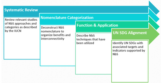 The first step in the methodological pathway was to conduct a systematic review to identify relevant studies of NbS. The second step was to categorize, deconstruct, and define NbS nomenclature. The third step was identifying their unique characteristics, common applications, and multiple co-benefits. The fourth step in the methodological pathway was to identify the individual UN SDGs supported by each NbS.