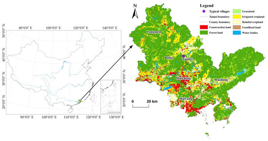 Huizhou is located between 22°24′–23°57′ N and 113°51′–115°28′ E and belongs to the subtropical monsoon humid climate zone in South China (Figure 1). The annual average temperature is 22 °C, the annual average precipitation is 1770 mm, and the frost-free period lasts up to 350 days. Forest land accounts for 63.67% of the area of Huizhou, with a forest coverage rate of 90.4%, and is mainly distributed in the eastern and northwestern regions. Irrigated cropland and rainfed cropland are more contiguous, accounting for 16.01% and 7.29% of the area, respectively. Construction land accounted for 7.5% and is primarily distributed in the southwest and central areas. Various land types in the region are conducive to the development of agriculture and forestry. Litchi and longan are highly dependent on pollination. In this study, the relevant biophysical parameters of pollination service evaluations of longan and litchi orchards in the villages, such as the species and number of pollinators for litchi and longan as well as the species of flowering plants and their vegetation coverage, were obtained from a field sampling survey of four typical villages. The villages are located in the town of Jimei, Boluo County. The land-use types and planting structure of the villages are consistent with the overall scenario of Huizhou.