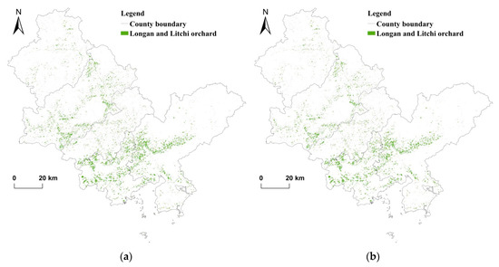 Spatial distribution of longan and litchi orchards in the study region in 2015–2019. (a) 2015; (b) 2019.
