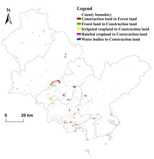 Spatiotemporal distribution of the main land-use conversions in the study region from 2015 to 2019.