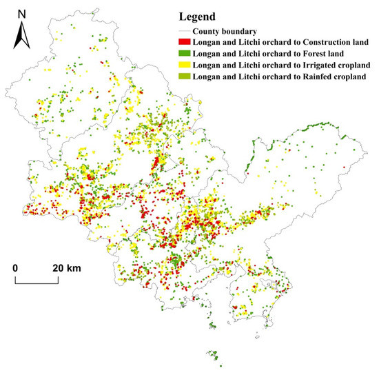 Spatiotemporal distribution of the main conversions of the longan and litchi orchards in the study region from 2015 to 2019.
