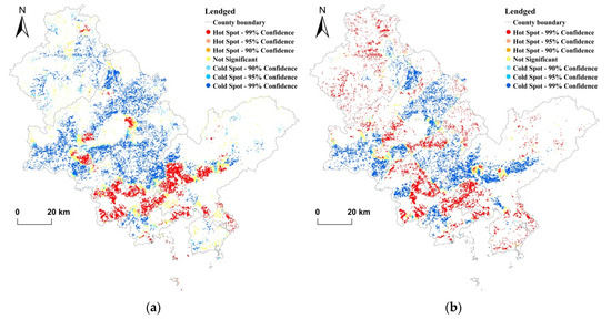 Hotspot analyses are widely applied in ecological analyses, and they were used to identify the locations of statistically significant hotspots and cold spots. Hotspots and cold spots are statistically significant spatial clusters of high values and low values, respectively [34]. The index is the coefficient for Hotspot analyses. It is based on partial spatial autocorrelation using a distance weighted matrix, which can detect aggregates of high-value areas and low-value areas [20]. The can be standardized to The and index are expressed by the following equation [35]: