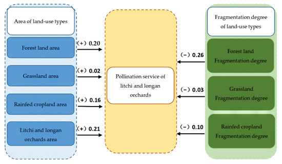 Influence mechanism of land use and its change on the pollination services for litchi and longan orchards. (Note: the influencing factors of the two types shown in the figure are the area of land use type and the landscape fragmentation of land use type. Numbers indicate their respective impact degrees on the pollination services of litchi and longan orchards, ranging from 0 to 1. (+) indicates positive impact, and (−) indicates negative impact).