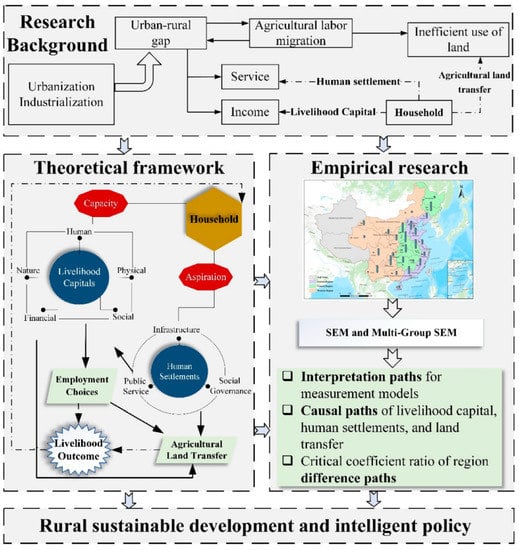 In this study, we construct a theoretical framework that integrates rural human settlements and household livelihood capitals to explore the causal pathway of agricultural land transfer through rural employment. In addition, regional development imbalances always exist due to natural, economic, and social reasons. The levels of effectiveness and differences in unexpected agricultural land transfer decision-making between the eastern, central, and western regions have also attracted attention, and are affected by the location, nature, resources, and economic conditions. The study is driven by the following questions: (i) How do household livelihood capitals and rural human settlements affect the livelihood decisions related to employment and agricultural land transfer, respectively? (ii) What role do employment choices play in the process of agricultural land transfer? (iii) Is the causal pathway consistent in different regions?