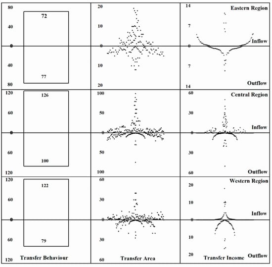 The significant relationships show that the transfer behavior, transfer area, and transfer income can represent the agricultural land transfer well. Specifically, the transfer behavior has a significant positive effect on the agricultural land transfer, indicating that the behavior of the agricultural land inflow can improve the value of the agricultural land transfer. Since the transfer area equals the inflow area minus the outflow area, a high transfer area indicates a high inflow or a low outflow. As expected, there is a significant positive relationship between the transfer area and agricultural land transfer (β = 0.648, p < 0.01). Similarly, there is a significant negative correlation between the transfer income and agricultural land transfer (β = −0.945, p < 0.01). To sum up, the agricultural land transfer has a positive relationship with the agricultural land inflow.