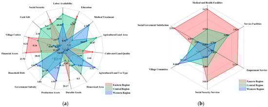 Table 4, Figure 4a,b provide the descriptive statistics for the explanatory variables and regional differences in household livelihood and rural settlement. The data show that about 60% of the household members are contributing members, with the percentage being slightly higher in the central region. The average length of education received by household members is around 6 years, with the rate being relatively higher in the eastern region. The annual expenditure on medicines and health care for a household is 3.89 thousand yuan, which is more attributed to the western region. On average, the households only own one type of agricultural land (1.26 counts) and the quality of the cultivated land is low (average 2.90), although the type of agricultural land used in the western region and the quality of cultivated land in the eastern region have certain advantages. Traditional small-scale farming (average of 10.37 mu of agricultural land per household) increases the cost of land use and the difficulty of its management, especially in the eastern region. The household’s access to physical capital shows large variations with the mean values for the homestead area (0.40 mu), durable goods (16.92 thousand yuan), and production assets (3.03 thousand yuan), being far from the maximum values. In the distribution of regional physical capitals, the advantages of the central region are reflected in the homestead area, along with the superiority of durable goods in the eastern region and production assets in the western region. Similarly, the huge difference between the mean value and the maximum value for the financial capital variables, including government subsidies, household debt, and financial assets, shows that the general economic level of the rural households is relatively low, while there is a small number of households with high financial capital. Despite the relatively high level of average government subsidies in the central region, the financial advantages of the eastern region cannot be ignored. Regarding the social capital, 14.66% of the households have one or more family members working in the village committee. The average amount of cash gifts expended by each household is 3.12 thousand yuan, owing to the central region. The average social security is 4.26 thousand yuan, which provides more opportunities for a household to choose high-income livelihoods, especially in the eastern region. In terms of the rural human settlement conditions, the satisfaction levels for social security (3.48) and medical and health facilities (3.52) are the highest, followed by the satisfaction levels for service facilities (2.86) and social governance (2.84). In contrast, the satisfaction level for the rural employment services is the lowest (only 1.89). In terms of the regional comparison, the employment services and social security occupy a dominant position in the eastern region, accompanied by a relative lag in service facilities in the western region.