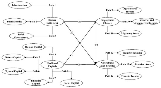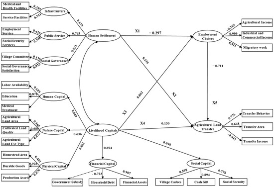This paper hypothesizes that the influence of livelihood capitals and human settlements on agricultural land transfer can be divided into two pathways—the direct impact path and the indirect impact path, as mediated by employment choices. The SEM provides reliable evidence for the theoretical hypothesis (Table 5).