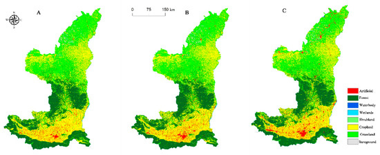 Figure 3. Land-cover maps of the YRBS for 2000–2020. (A) 2000, (B) 2010, and (C) 2020.