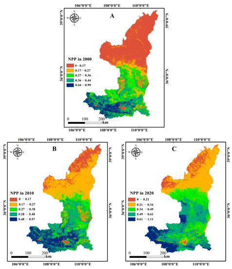 Figure 4. Distribution of NPP in the YRBS from 2000 to 2020 (raster mean). (A) 2000, (B) 2010, and (C) 2020. Unit: KgC/m2·year.