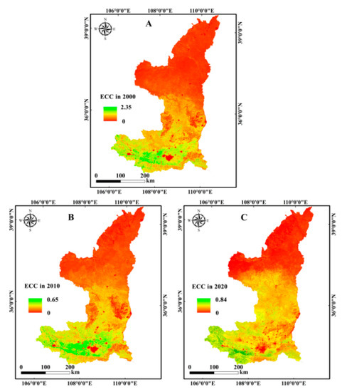 Figure 5. ECC in the YRBS from 2000 to 2020 (raster mean). (A) 2000, (B) 2010, and (C) 2020. Unit: Basin hectare (wha).