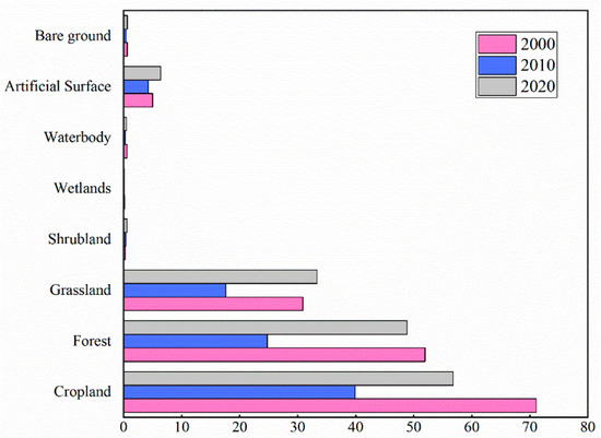 From 2000 to 2010, the areas of forests, shrubland, artificial ground, and bare land increased, with the largest increase in the artificial ground with an increase of 106,810 ha, an increase from 2.33% in 2000 to 3.13% in 2010 with an annual increase rate of 3.01%. Forest area increased significantly from 25.96% in 2010 to 26.22% in 2010 with an annual increase rate of 0.10%. The area of shrubland increased from 0.34% to 0.46%. The areas of cultivated land, grassland, wetlands, and waterbodies decreased. The area of cultivated land decreased the most from 39.37% in 2000 to 38.62% in 2010 with an annual decrease rate of 0.19%. The area of grassland decreased at an annual rate of 0.12%.
