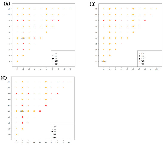 Figure 8. Results of the detection of interactions. (A) 2000, (B) 2010, and (C) 2020.