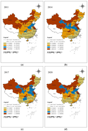 The values of FGTIE for 30 provinces in China from 2011 to 2020 are shown in Table A1. We used ArcGIS10.6.1 to visualise the spatiotemporal dynamics of China’s FGTIE. Figure 1 presents the spatiotemporal distributions of FGTIE in 2011 and 2020; different colours indicate different levels of efficiency. To explore the spatial distribution of FGTIE and its evolution, we categorise China’s FGTIE into four classes of low-, medium-, higher- and high-efficiency, conducting spatial visualisation and comparative analyses based on the four time periods of 2011, 2014, 2017 and 2020.