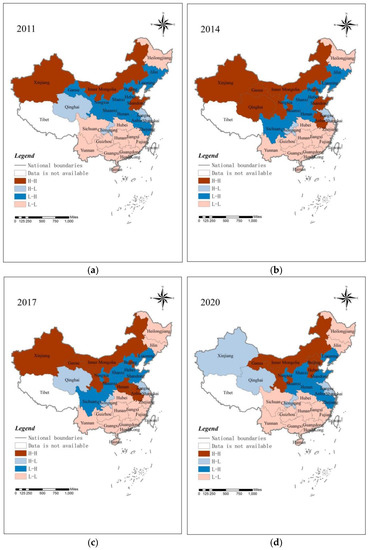 (a) Local Moran’s I of provincial FGTIE for 2011; (b) Local Moran’s I of provincial FGTIE for 2014; (c) Local Moran’s I of provincial FGTIE for 2017; (d) Local Moran’s I of provincial FGTIE for 2020.