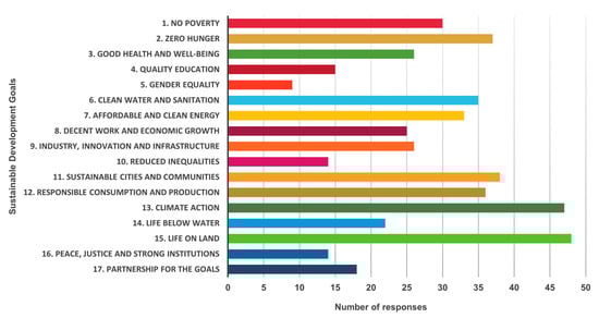 Numerous academic, scientific, government, and public sector entities from the national, regional, and international levels participated in the survey, particularly from the environmental, agricultural, and climate sectors. The results revealed that land cover information is very important and is used for all SDGs at different levels and dimensions, particularly for climate action (SDG 13) and life on land (SDG 15) (Figure 1) [,]. Moreover, the results indicated that the lack of documentation and information on land cover and unavailability of existing datasets are the main issues in the development of consistent and/or harmonized land cover maps.
