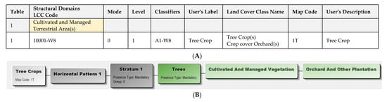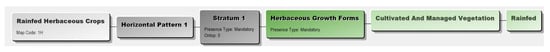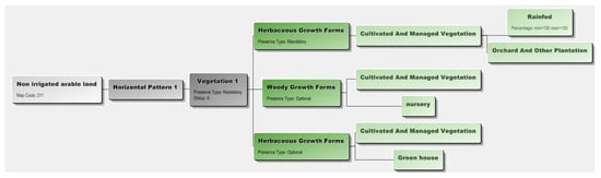 - Country- or region-specific legend available and translated to LCML, e.g., non-irrigated arable land [] translated into LCML using LCCS version three (LCCS3) software. This class was translated as “herbaceous growth forms” with the characteristics “cultivated and managed” and “rainfed”. With an “optional” presence type of the LCML element “woody growth form” defined by a standard characteristic as “Orchard and other Plantation” (Figure 3);